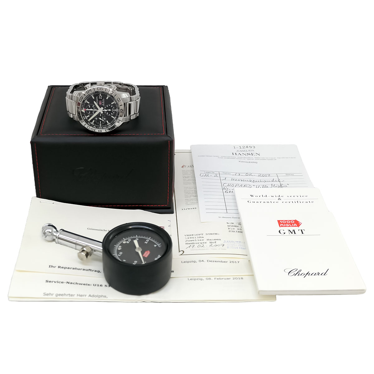Die Uhr ist inspiriert vom legendären Autorennen Mille Miglia, bei dem Chopard offizieller Zeitnehmer und Sponsor ist. Die Mille Miglia Kollektion zeichnet sich durch ihr sportliches Design aus, das Anleihen an klassischen Rennwagen nimmt. Die Uhr ist COSC-zertifiziert. Dieser außergewöhnliche Zeitmesser verfügt über ein robustes 42,5-mm-Edelstahlgehäuse, in dem ein mechanisches Chronographenwerk mit Automatikaufzug und GMT-Funktion untergebracht ist, so dass Sie zwei Zeitzonen gleichzeitig verfolgen können. Das markante Zifferblatt verbindet vom Rennsport inspirierte Elemente mit luxuriöser Handwerkskunst und zeigt drei Hilfszifferblätter für Chronographenfunktionen und ein Datumsfenster. Die Uhr bietet eine außergewöhnliche Ablesbarkeit mit Leuchtzeigern und -indexen, während die Tachymeterskala auf der Innenlünette Geschwindigkeitsberechnungen ermöglicht – eine Anspielung auf die Abstammung aus dem Rennsport.
