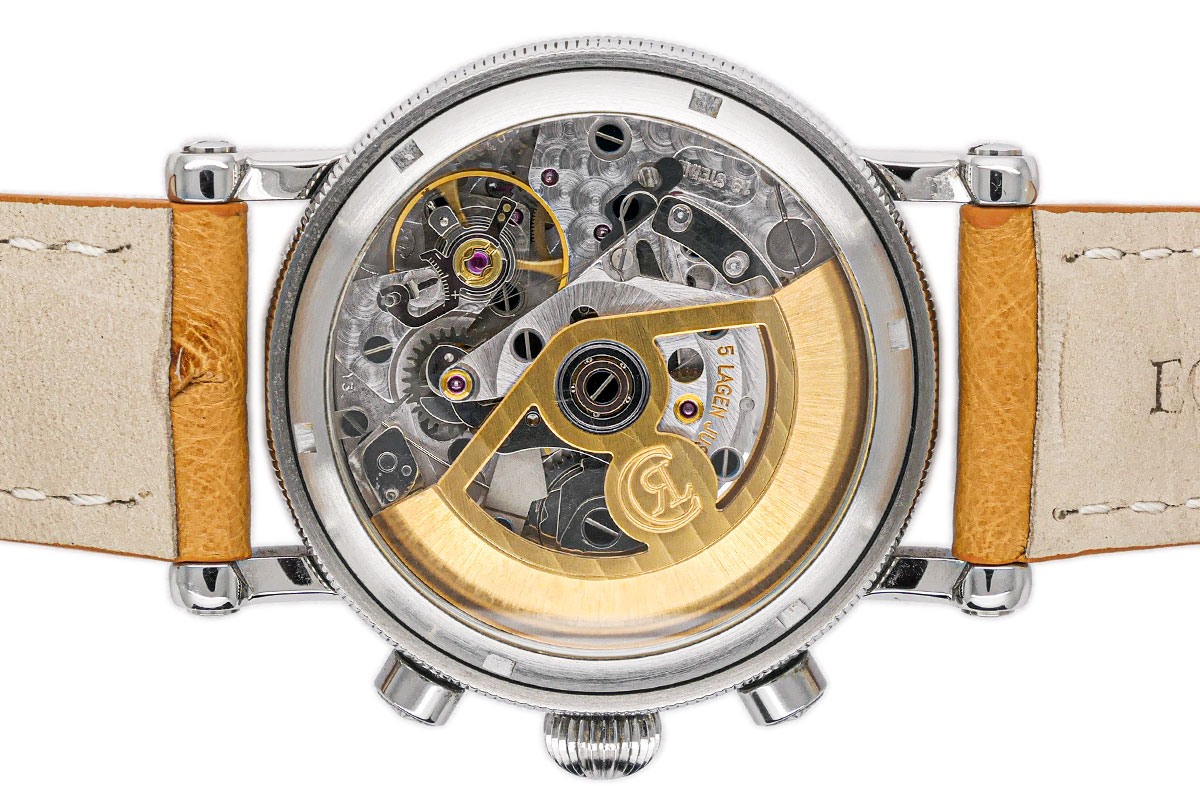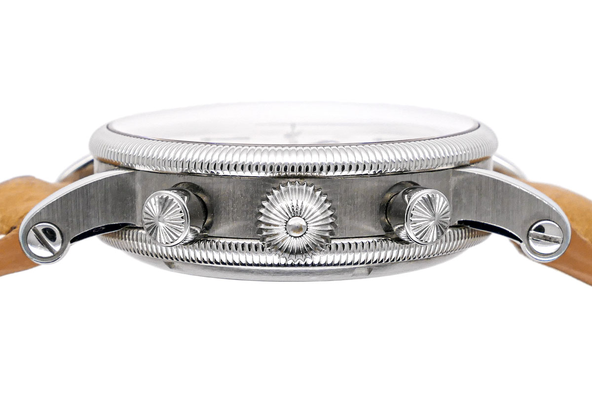 Die Zeitanzeige erfolgt über gebläute Stahlzeiger und arabische Ziffern. Der Chronograph ermöglicht präzise Zeitmessungen bis auf 1/5 Sekunde. Das hochwertige Lederarmband mit Dornschließe sorgt für hohen Tragekomfort.