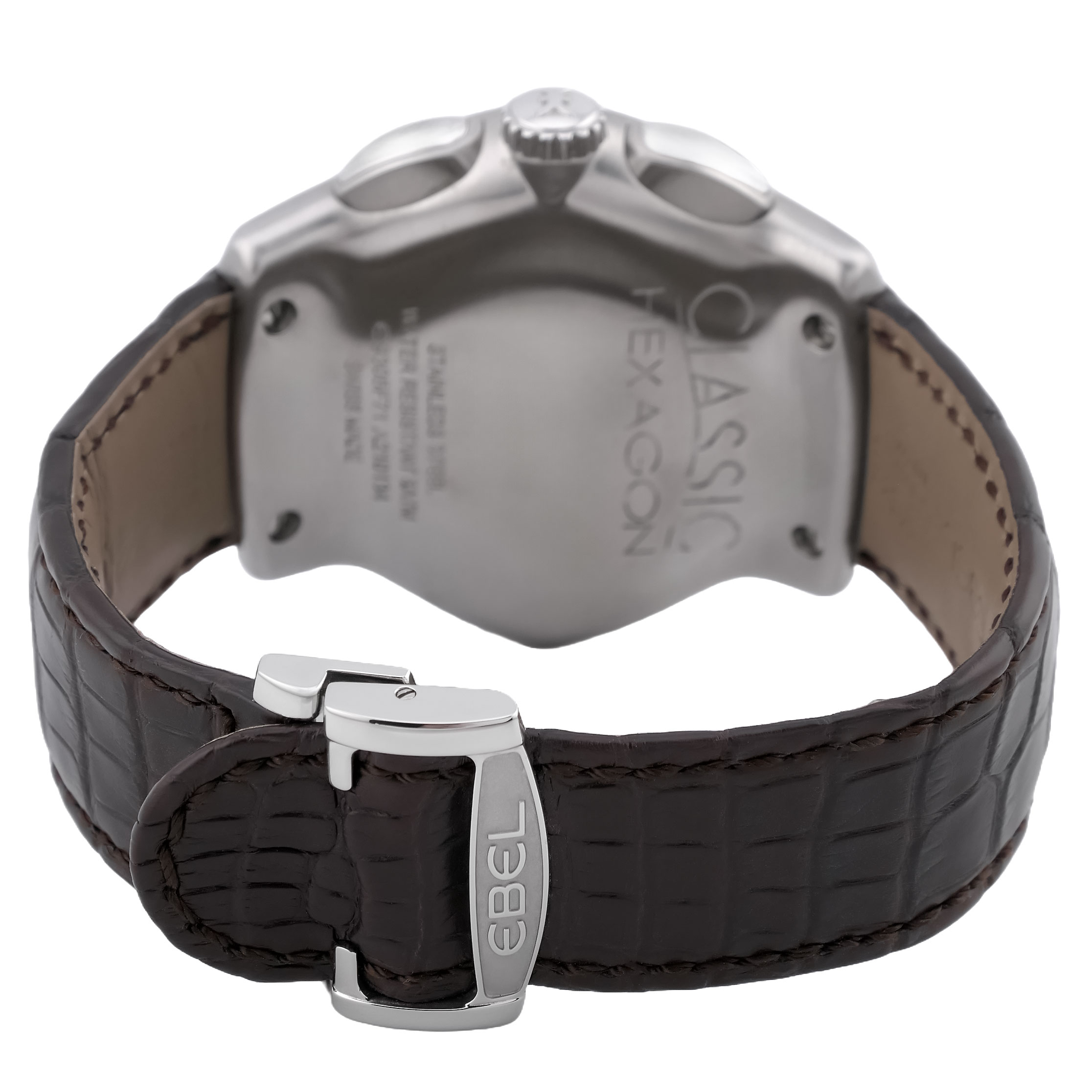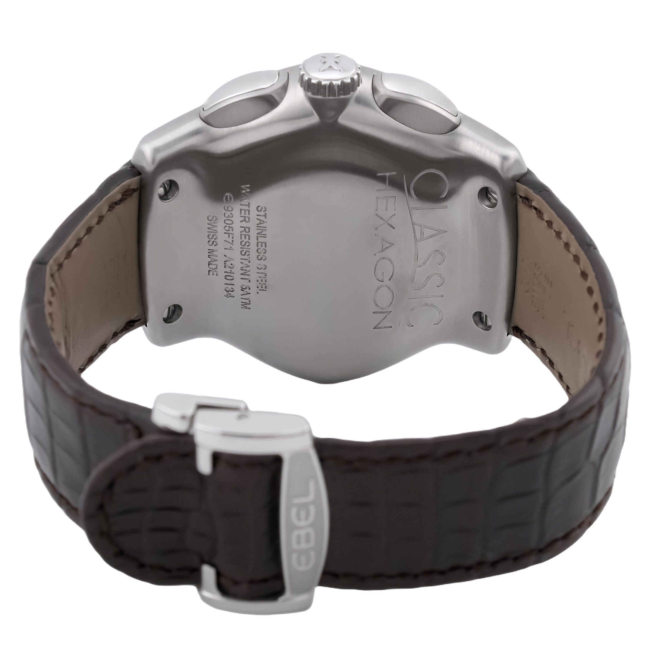 Die EBEL 1911 Classic Hexagon Big Date Chronograph 48 mm Kaliber 305 mit der Referenz E9305F71 ist eine markante und sportliche Armbanduhr, die durch ihr außergewöhnliches Design und ihre hochwertige Verarbeitung auffällt. Das Gehäuse besteht aus Edelstahl und hat einen sehr großen Durchmesser von 48 mm, was der Uhr eine starke Präsenz am Handgelenk verleiht. Die Gehäuseform ist sechseckig (Hexagon), was der Uhr ein einzigartiges und markantes Aussehen verleiht. Die Uhr verfügt über verschraubte Drücker und eine verschraubte Krone, was zur Wasserdichtigkeit beiträgt. Das Zifferblatt ist schwarz, mit klaren und gut ablesbaren Indizes und Chronographenzählern. Die Zifferblätter haben ein sehr Technisches und sportliches Aussehen. Die große Datumsanzeige (Big Date) befindet sich in der oberen Hälfte des Zifferblatts. Ein kratzfestes Saphirglas schützt das Zifferblatt. Die Uhr besitzt eine schwarzes Lederarmband, komfortabel wie elegant. Die Uhr wird von einem automatischen Chronographenwerk angetrieben. Das Ebel Kaliber 305 wird verbaut.