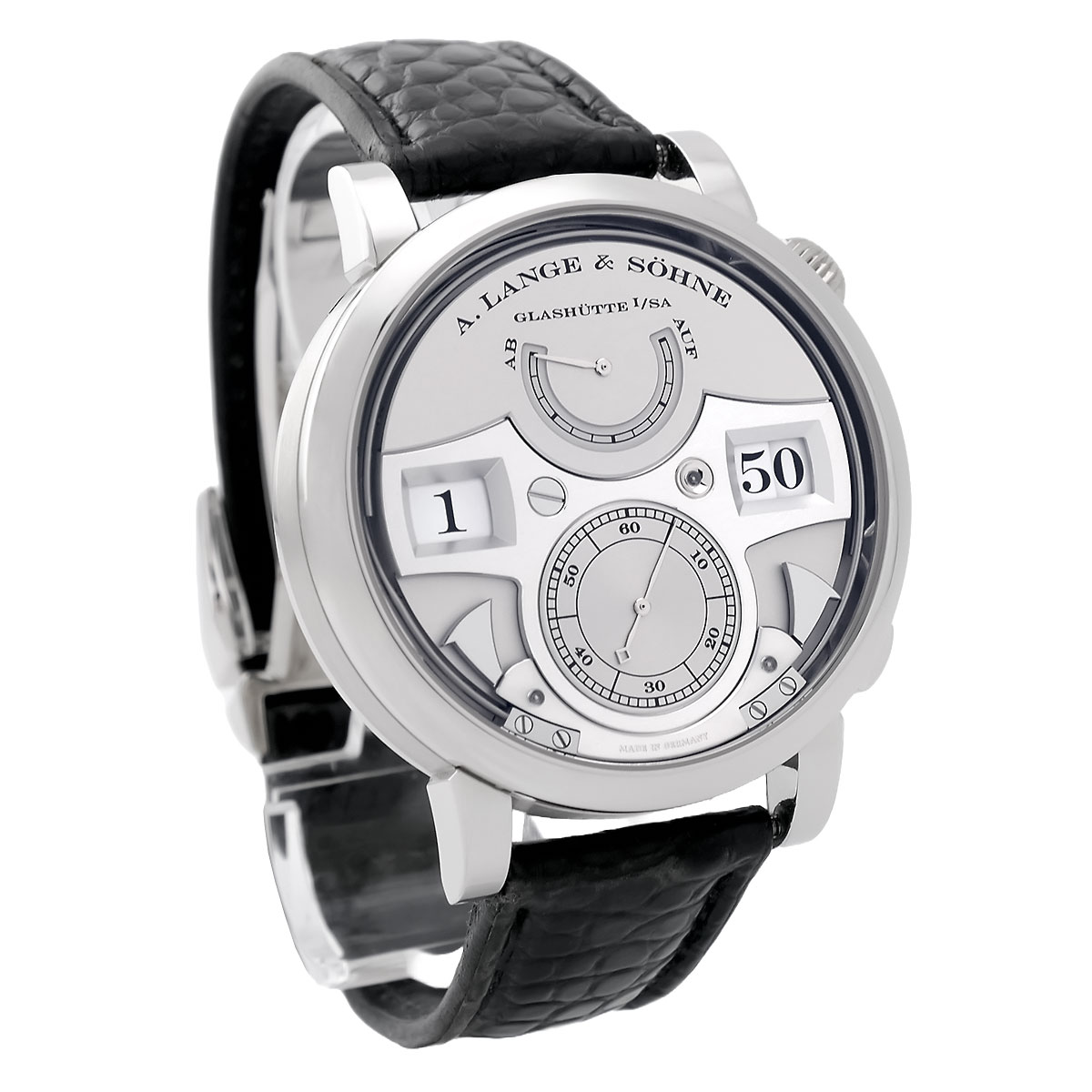 - Die charakteristische Große Zeitwerk-Anzeige dominiert die obere Zifferblattfläche