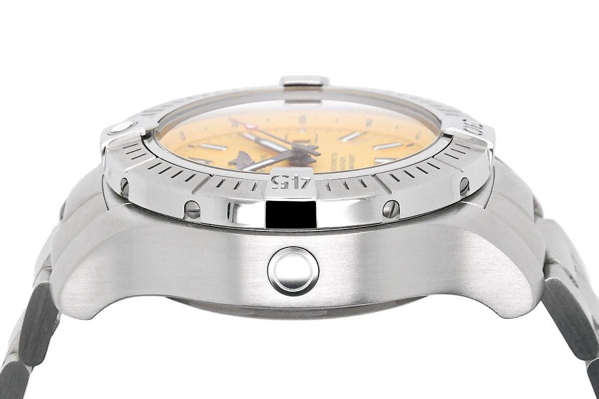 Die BREITLING Avenger Automatic 45 Seawolf Kaliber 17 mit der Referenz A17319101I1A1 ist eine außergewöhnliche Taucheruhr, die Robustheit, Präzision und stilvolle Ästhetik vereint. Als Teil der Avenger-Kollektion zeichnet sie sich besonders aus. Das Gehäuse besteht aus robustem Edelstahl und hat einen Durchmesser von 45 mm, was der Uhr eine markante Präsenz am Handgelenk verleiht. Die Uhr ist bis zu einer Tiefe von 3.000 Metern (10.000 Fuß) wasserdicht – ideal für professionelle Taucher. Die Uhr verfügt über eine verschraubte Krone und einen verschraubten Gehäuseboden, was zur hohen Wasserdichtigkeit beiträgt. Die einseitig drehbare Lünette mit 60-Minuten-Skala ermöglicht es Tauchern, die Tauchzeit präzise zu messen. Das Zifferblatt ist in einem auffälligen Gelbton gehalten, was die Ablesbarkeit unter Wasser verbessert. Die Indizes und Zeiger sind mit Leuchtmasse versehen, was die Ablesbarkeit bei allen Lichtverhältnissen gewährleistet. Datumsanzeige auf der 3 Uhr Position. Ein kratzfestes Saphirglas mit beidseitiger Antireflexbeschichtung schützt das Zifferblatt. Die Uhr ist mit einem Edelstahlarmband ausgestattet, das einen sicheren Halt bietet. Die Uhr wird von einem automatischen Chronometerwerk angetrieben, dem Breitling Kaliber 17, das auf dem ETA 2824-2 basiert. Das Werk hat eine Gangreserve von ca. 38 Stunden.