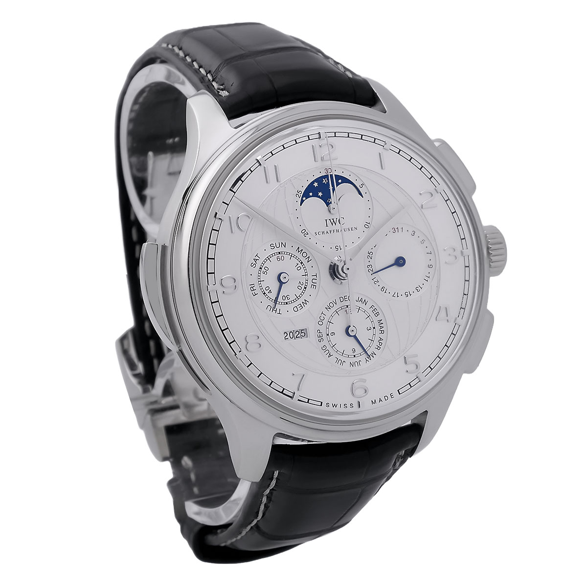 Dieses rare Exemplar ist limitiert, im vollständigen Set und in makelloser NOS-Beschaffenheit. Er verkörpert den Geist von mehr als 150 Jahren IWC-Historie. Das gewichtige, kühle Platingehäuse schmiegt sich wie ein wertvoller Schatz an das Handgelenk, während das perfekt ausbalancierte Zifferblatt mit ewigem Kalendarium, Chronograph und Minutenrepetition die gesamte Grande Complication-Tradition in sich vereint.