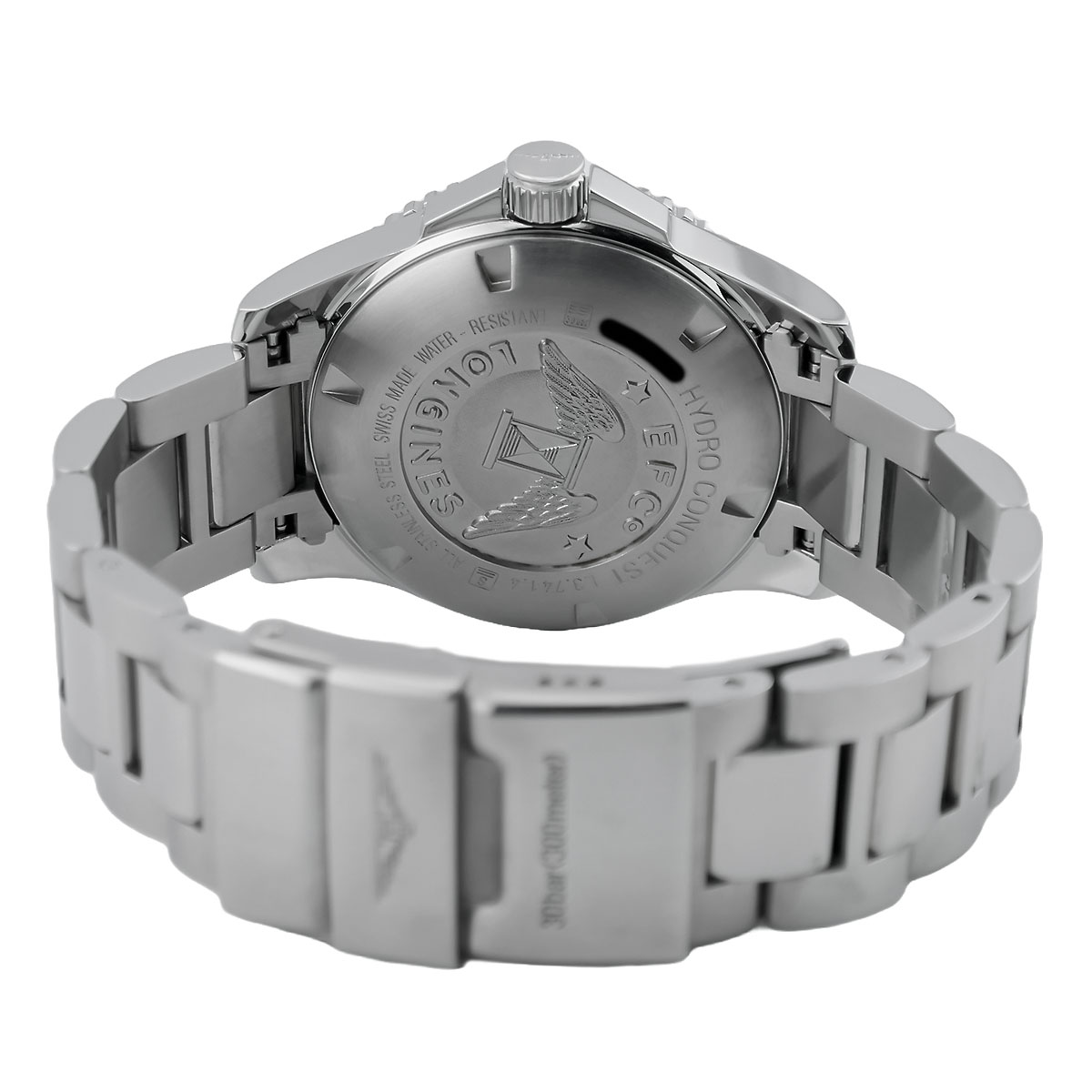 Die Longines HydroConquest mit der Referenz L3.741.4.56 ist eine beeindruckende Taucheruhr, die durch ihr elegantes Design und ihre herausragenden technischen Eigenschaften besticht. Mit einem Gehäusedurchmesser von 39 mm und einer Dicke von 11,9 mm präsentiert sich die Uhr in einem robusten Edelstahlgehäuse, das sowohl für den täglichen Gebrauch als auch für anspruchsvolle Unterwasseraktivitäten geeignet ist. Das Zifferblatt der HydroConquest ist in einem tiefen Sunray-Schwarz gehalten, das eine gute Lesbarkeit der Indizes ermöglicht. Die großen, gut lesbaren Stunden- und Minutenzeiger sind mit einer lumineszierenden Beschichtung versehen, die eine hervorragende Ablesbarkeit auch bei schlechten Lichtverhältnissen gewährleistet. Die markante, dreieckige Stundenmarkierung bei 12 Uhr und die klaren arabischen Ziffern bei 6 und 9 Uhr tragen zusätzlich zur Benutzerfreundlichkeit bei. Die Lünette ist einseitig drehbar, was eine präzise Zeitmessung der Länge des Tauchganges ermöglicht. Sie ist mit einer taktilen Riffelung versehen, die eine einfache Handhabung auch mit nassen Händen oder Handschuhen erlaubt. Der Druck auf die Lünette wird durch eine spezielle Mechanik gesichert, die ein versehentliches Verstellen während des Tauchgangs verhindert. Das Uhrwerk der HydroConquest L3.741.4.56 ist ein automatisches Kaliber L888.2 basiert auf ETA 2892-2, das für seine Zuverlässigkeit und Präzision bekannt ist. Mit einer Gangreserve von bis zu 72 Stunden bietet es eine beeindruckende Leistung, sodass die Uhr auch bei längeren Tragepausen stets einsatzbereit bleibt. Die Uhr ist bis zu 300 Meter wasserdicht, was sie zu einem idealen Begleiter für Taucher und Wassersportler macht. Das integrierte Edelstahlarmband mit einer Sicherheitsfaltschließe sorgt nicht nur für einen sicheren Halt am Handgelenk, sondern verleiht der Uhr auch eine elegante Note. Das Armband ist zusätzlich mit einem Verlängerungsmechanismus ausgestattet, der eine Anpassung an den Neoprenanzug ermöglicht.