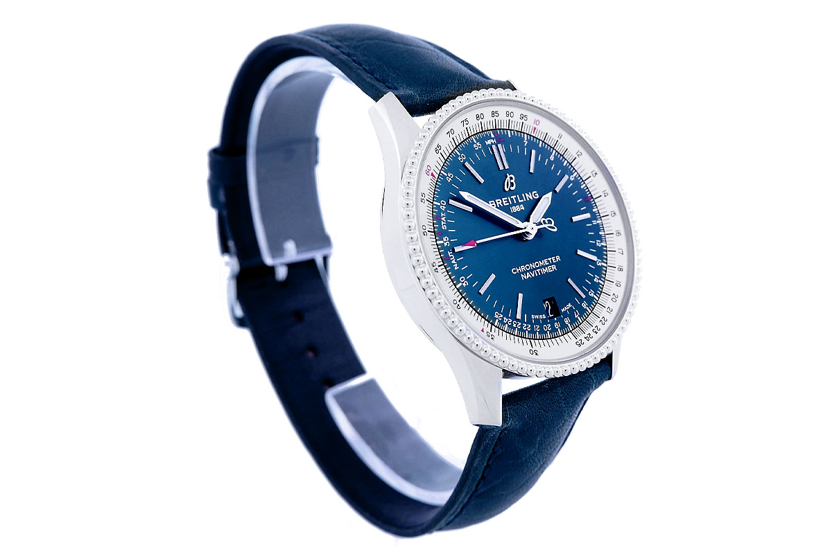The Breitling Navitimer 1 Automatic 38 Caliber 17 with the reference A17325211C1P2 is a stylish and classic wristwatch that is characterized by its striking design and precise mechanics. The case is made of stainless steel and has a diameter of 38 mm, making the watch suitable for both men and women. The water resistance is 3 bar. The dial is in an appealing shade of blue, which gives the watch an elegant touch. The watch has a rotating bezel. A scratch-resistant sapphire crystal with anti-reflective coating on both sides protects the dial. The watch is fitted with a blue leather strap that offers a secure and comfortable grip. The watch is powered by an automatic chronometer movement, the Breitling Caliber 17, which has a power reserve of approx. 38 hours. The movement is COSC certified.