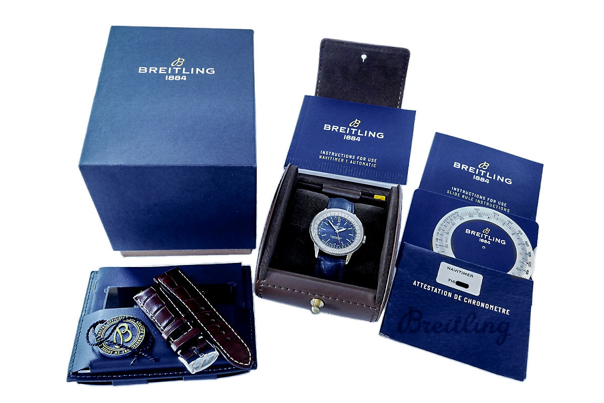 Special features: Breitling's Navitimer collection is known for its pilot's watches with slide rule function. The watch has a screw-down crown. The watch has a screw-down case back. The watch has luminous hands and luminous indices. The watch has a chronometer certificate.