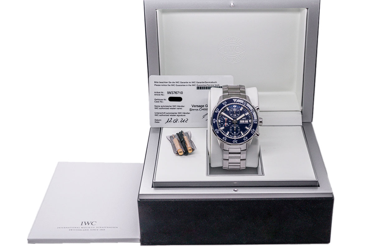 Experience the perfect symbiosis of functionality and elegance with the IWC Aquatimer Chronograph Caliber 79320 with the reference IW376710. This watch is more than just a timepiece; it is a statement for those who seek adventure without sacrificing style. The case is made of stainless steel and has a diameter of approximately 44 mm, and the case shape is sporty and robust, typical of IWC's Aquatimer collection. The watch has a screw-down crown and a screw-down case back, which contributes to its water resistance. The unidirectional rotating bezel with a 60-minute scale enables divers to measure their diving time precisely. The dial is blue, with clear and easy-to-read indices and hands. The hands and indices are coated with luminous material, which ensures legibility in all lighting conditions. The reference IW376710 is characterized by a blue dial. A scratch-resistant sapphire crystal protects the dial. The watch is fitted with a stainless steel bracelet. The watch is powered by an automatic chronograph movement, the IWC caliber 79320, which is based on the ETA 7750.