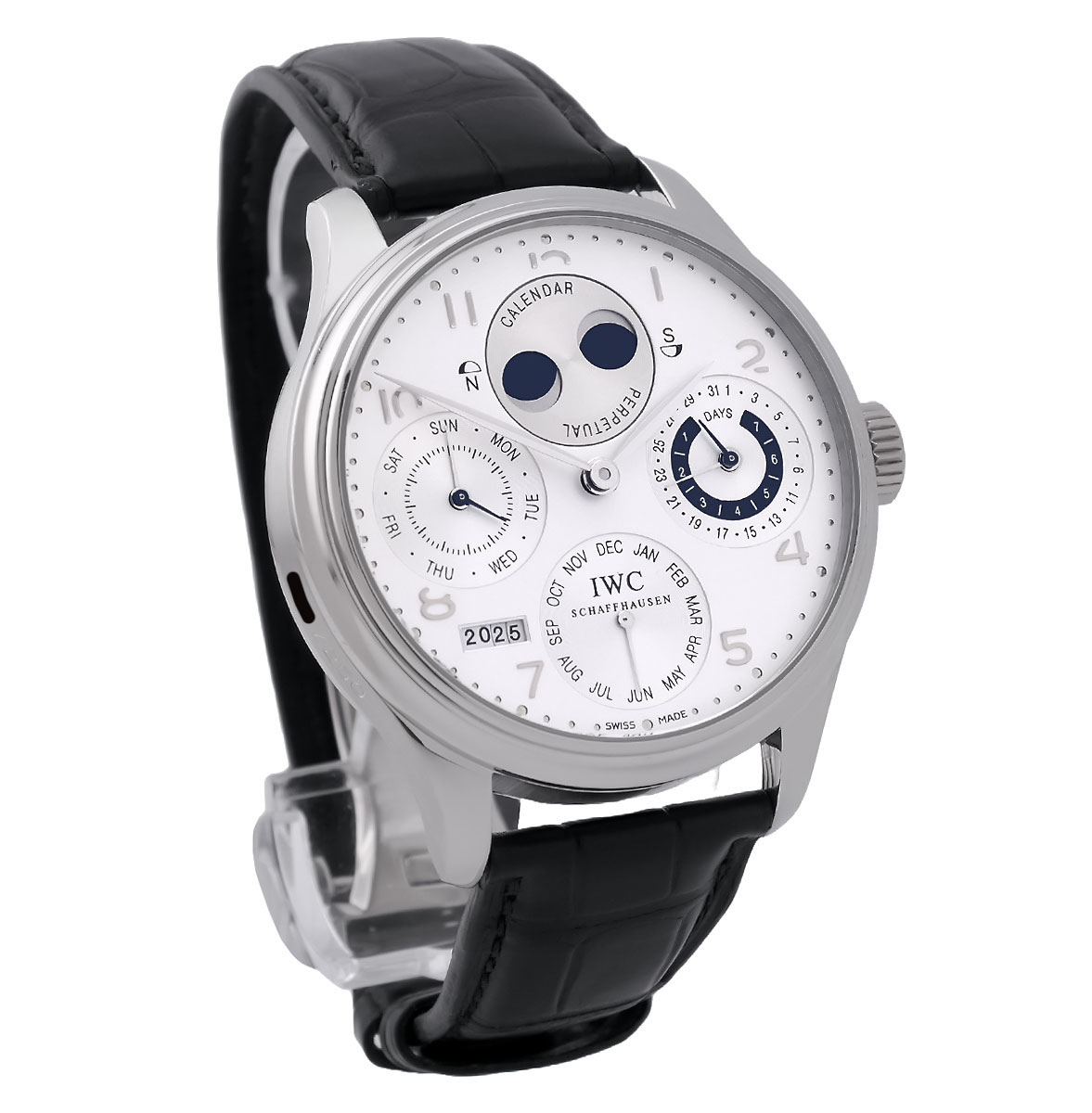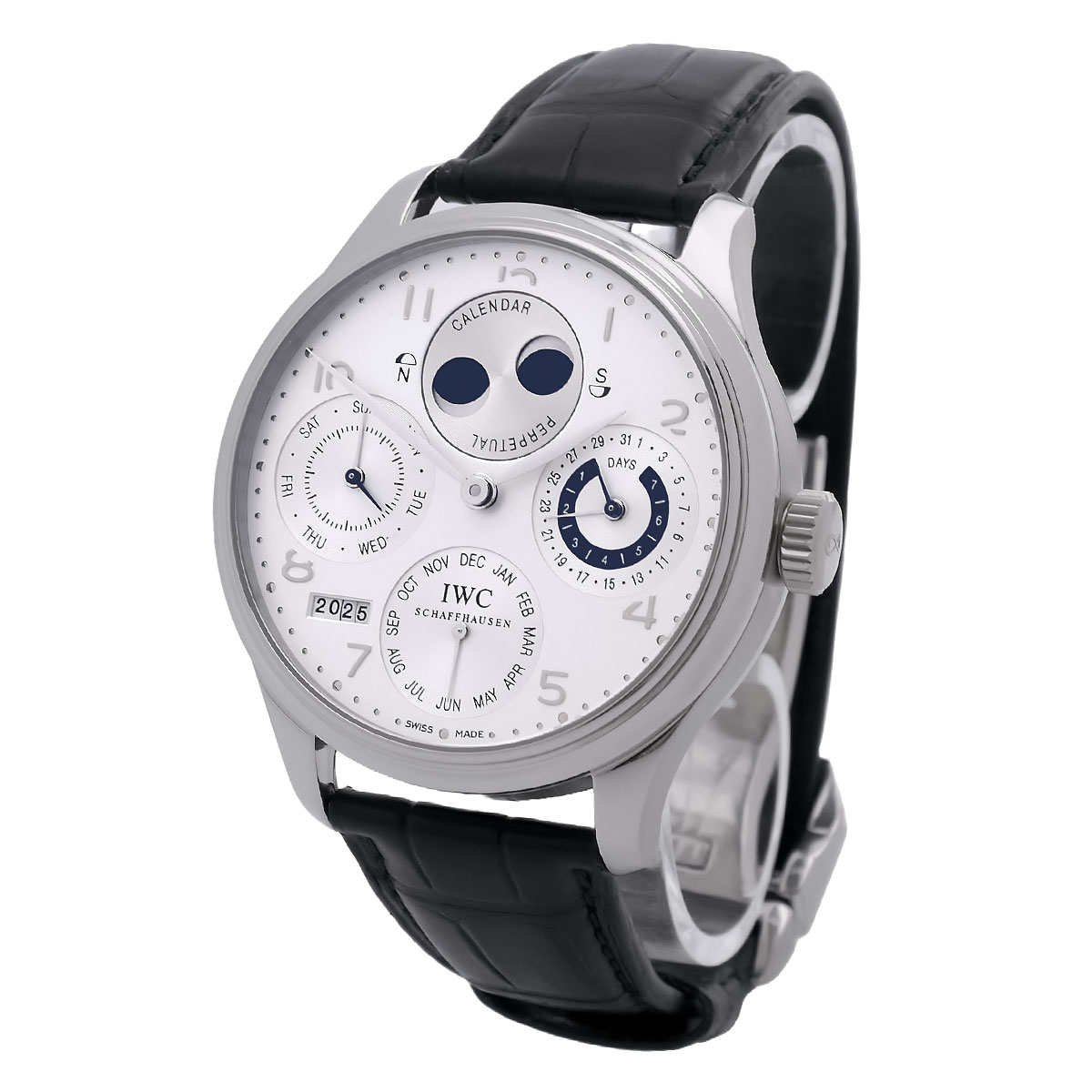 Automatic | IWC caliber 50611, 18,800 A/h | Pellaton winding (patented), 8-day power reserve (theoretical) | practically limited to 7 days | hours | minutes | small seconds | perpetual calendar with date | day of the week | month | four-digit year display | double moon phases (for the northern and southern hemispheres of the earth)