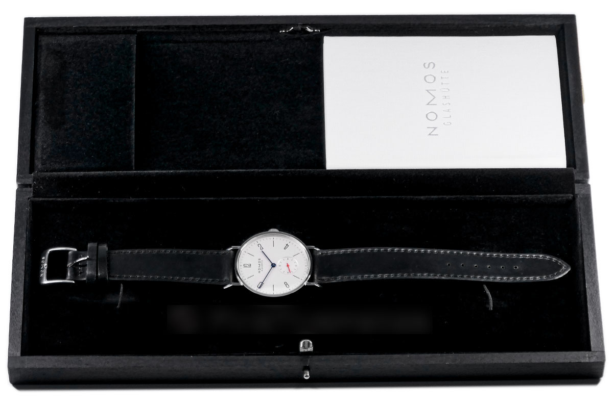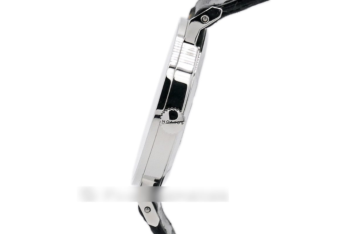 The NOMOS Glashütte Tangente 100 Years Bauhaus Jeweler OEKE is a special edition of the iconic Tangente watch, created to mark the 100th anniversary of Bauhaus and the anniversary of the jeweler OEKE (1919-2009). The case is made of stainless steel and has the typical Tangente shape with clear lines and right angles. This model has a case diameter of 35 mm. The dial of this watch is protected by a sapphire crystal, while the sapphire crystal back allows a view of the movement engraved with "bauhaus 2009". The dial is kept in a sketch paper-colored tone reminiscent of the Bauhaus aesthetic. The Arabic numerals and clear hands ensure excellent legibility. The watch wears a black shell cordovan leather strap with a stainless steel pin buckle. The watch is powered by a hand-wound movement, typically the NOMOS Alpha movement.