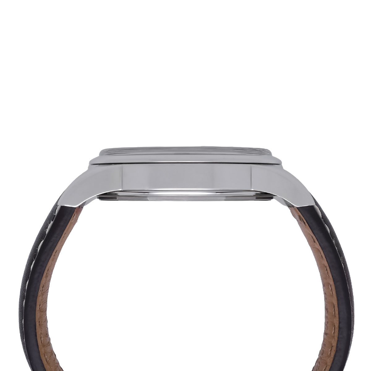 Das makellose, opalisierende Zifferblatt strahlt eine puristische Klarheit aus, die fasziniert. Es ist umrahmt von facettierten Indexen und dem markanten Fadenkreuz-Motiv. Angetrieben durch ein COSC-zertifiziertes Automatikwerk, steht diese Uhr für kompromisslose Präzision und Zuverlässigkeit.