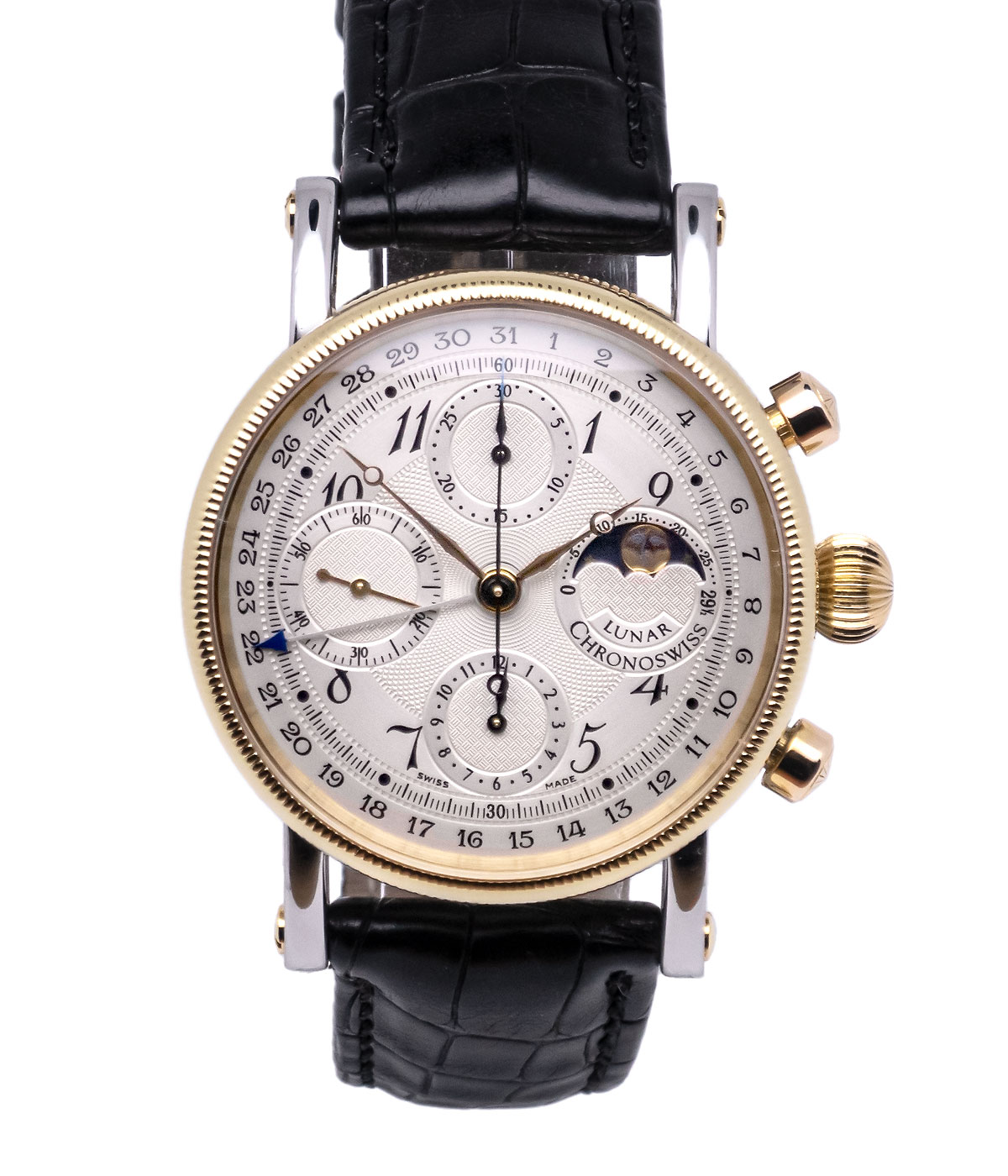 Funktionen: Stunden, Minuten, Sekunden, Chronograph, Mondphase, Zeigerdatum.