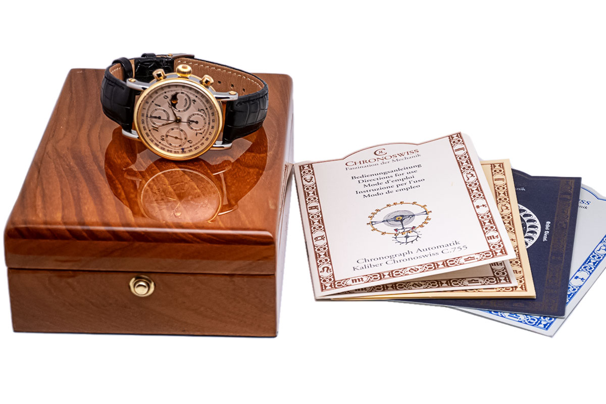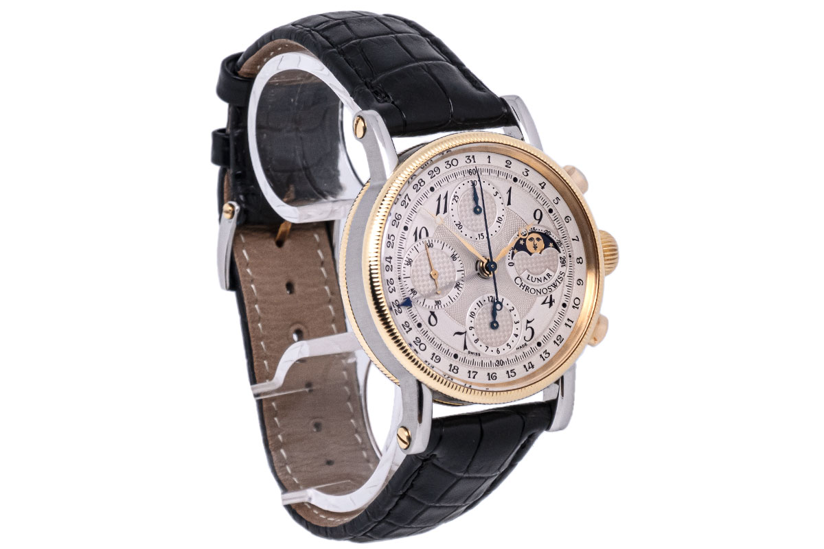 Die Chronoswiss Lunar Chronograph Kaliber C.755 mit der Referenz CH7522 ist eine exquisite Armbanduhr, die durch ihr klassisches Design, ihre nützlichen Komplikationen und ihre hochwertige Verarbeitung besticht. Als Manufakturuhr vereint sie Schweizer Präzision mit traditioneller Handwerkskunst und unterstreicht durch ihre Bi-Color-Ausführung den exklusiven Charakter dieser CHRONOSWISS-Kreation.