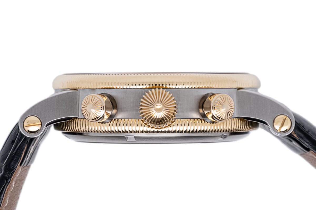 Die Chronoswiss Lunar Chronograph Gold/Stahl Kaliber C.755 mit der Referenz CH7522 ist eine exquisite Armbanduhr, die sich durch ihr klassisches Design, ihre hochwertige Verarbeitung und ihre nützlichen Komplikationen auszeichnet. Das Gehäuse besteht aus einer Kombination von Edelstahl und Gold, was der Uhr einen edlen und zeitlosen Look verleiht. Der Durchmesser des Gehäuses beträgt ca. 38 mm, was eine angenehme Größe für die meisten Handgelenke darstellt. Die kannelierte Lünette ist aus 18kt Gelbgold. Die Uhr verfügt über ein Saphirglas auf der Vorder- und Rückseite, was den Blick auf das Uhrwerk ermöglicht. Die Gehäusehöhe beträgt ca. 15mm. Das guillochierte Zifferblatt ist in der Farbe Silber gehalten und aus Sterlingsilber in aufwändiger Handarbeit gefertigt. Die Zeiger sind fein und elegant gestaltet, oft in gebläuter Form. Das Zifferblatt hat arabische Ziffern. Es befinden sich verschiedene Hilfszifferblätter auf dem Hauptzifferblatt. Die Zifferblätter haben ein sehr klassisches und edles Aussehen. Die Uhr trägt ein hochwertiges schwarzes Lederarmband. Die Uhr wird von einem automatischen Uhrwerk angetrieben, das für seine Präzision und Zuverlässigkeit bekannt ist. Chronoswiss Kaliber C.755. Das Uhrwerk hat ca. 46 Stunden Gangreserve.