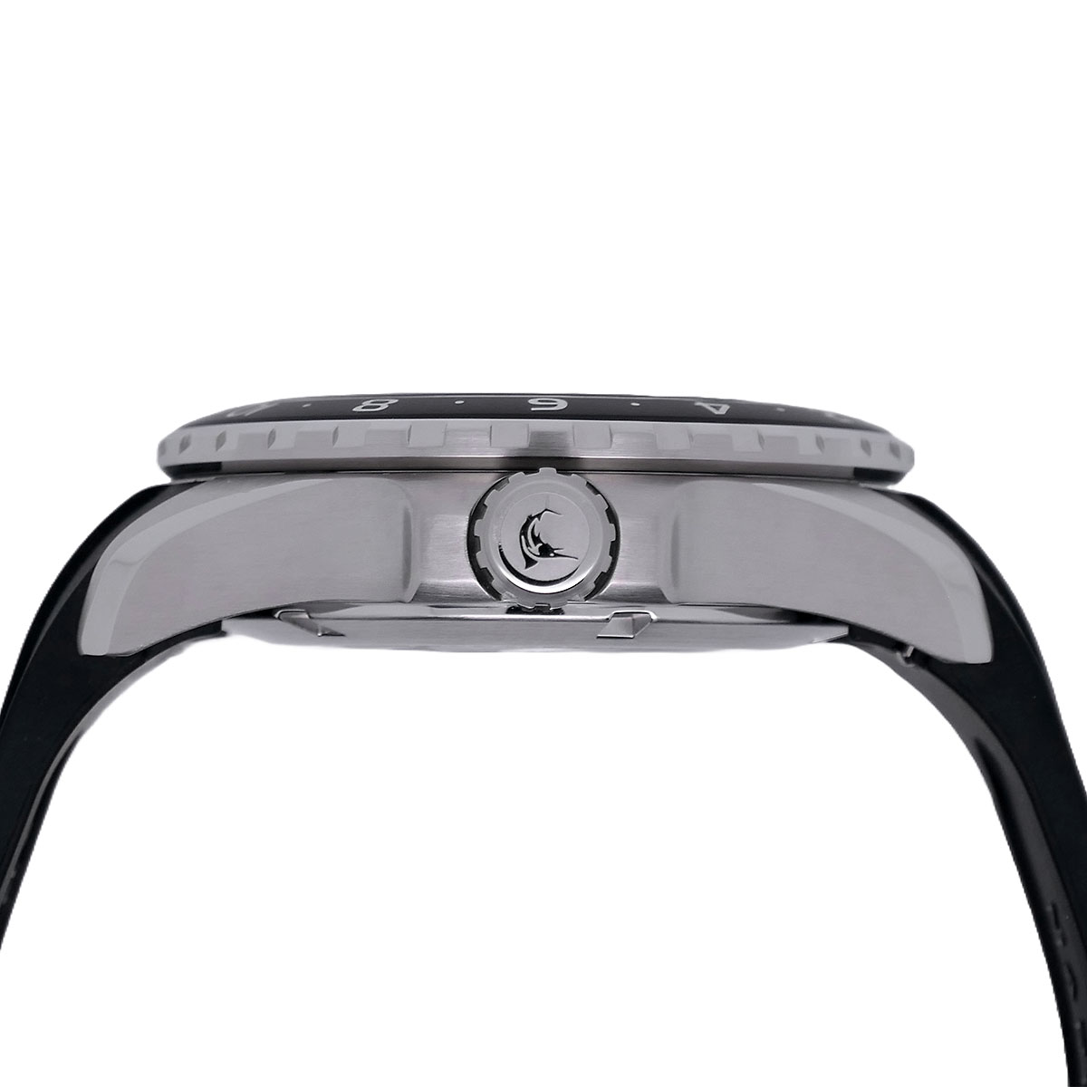 Besondere Merkmale: Die Uhr ist bis zu 300 Meter (30 ATM) wasserdicht. Der erhabene Schwertfisch, der sich über das Zifferblatt, die Krone, sowie die Schließe erstreckt, stellt auch mit seiner Präsenz auf dem Gehäuseboden ein markantes Designmerkmal dieser Serie dar. Die Zeiger, Zifferblatt-Indizes und die Lünetten Beschriftung sind mit Leuchtmasse versehen, Superluminova.