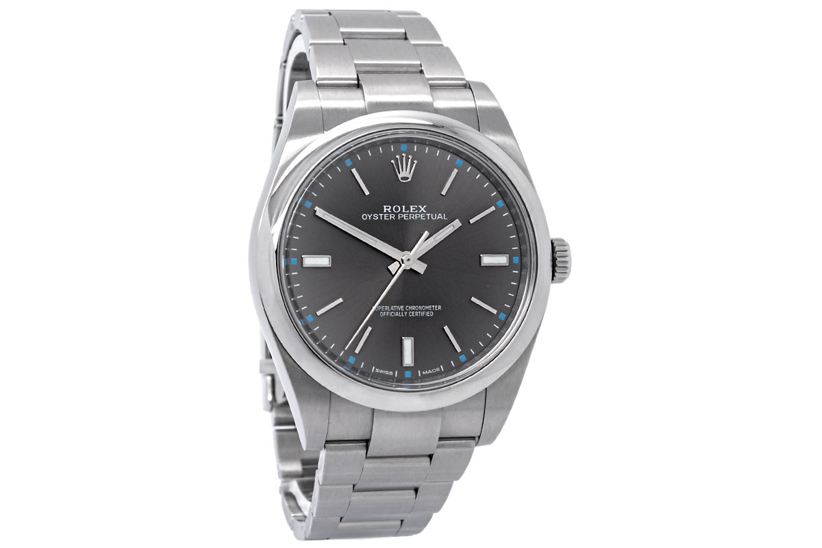 Besondere Merkmale: Die Uhr ist bis zu 100 Meter (10 bar) wasserdicht. Die Oyster Perpetual 39 mit dem „Dark Rhodium“-Zifferblatt ist ein sehr beliebtes Modell, das aufgrund seiner Schlichtheit und Vielseitigkeit geschätzt wird. Die Uhr ist in neuwertigem Zustand.