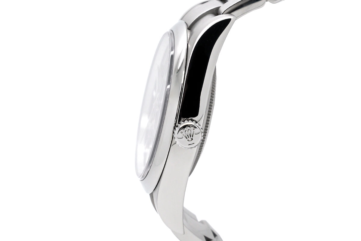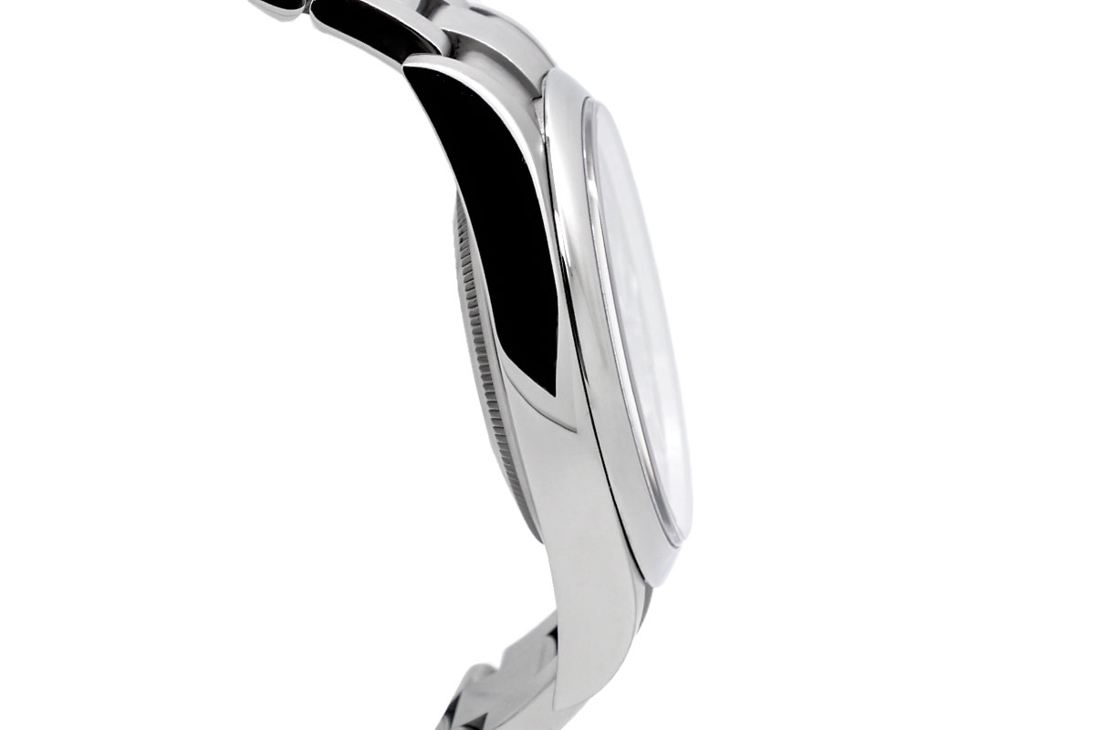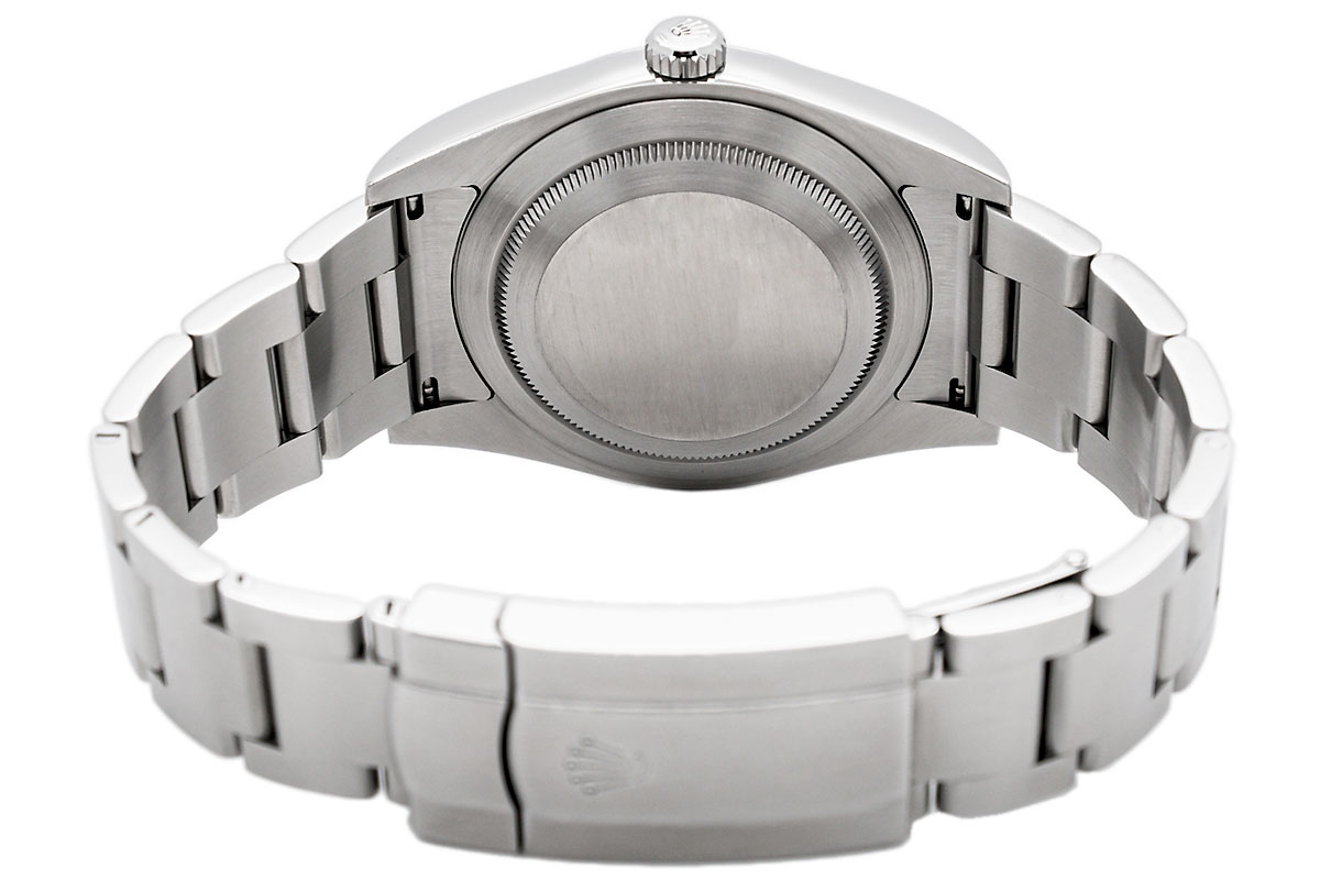 Das „Dark Rhodium“-Zifferblatt (dunkles Rhodium) ist ein charakteristisches Merkmal dieser Referenz und verleiht der Uhr einen modernen und edlen Look. Die Indizes und Zeiger sind mit Chromalight-Leuchtmasse versehen, was eine gute Ablesbarkeit bei allen Lichtverhältnissen gewährleistet. Die Schlichtheit des Zifferblatts unterstreicht die Eleganz der Uhr. Ein kratzfestes Saphirglas schützt das Zifferblatt. Das Oyster-Armband besteht ebenfalls aus Oystersteel und ist mit einer Oysterlock-Faltschließe ausgestattet, die einen sicheren und komfortablen Halt gewährleistet. Die Uhr wird vom Rolex-Manufakturwerk Kaliber 3132 angetrieben, einem automatischen Chronometerwerk, das für seine Präzision und Zuverlässigkeit bekannt ist. Das Werk ist COSC-zertifiziert (Contrôle Officiel Suisse des Chronomètres).